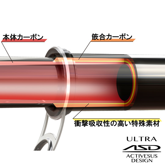 振出竿のポテンシャルを限界まで引き出す「ウルトラASD」を搭載。振出竿のスムーズな曲がりのネックになる継ぎ目の段差(クリアランス)を極限まで削減。その上、継ぎ目の材料に衝撃吸収性の高い特殊素材を使うことで、硬さを出すことなく、がま磯史上最もスムーズに曲がりこむ、まさにワンピースロッドのような応力伝達を可能にしました。継ぎ目の硬さの違いで竿の曲がりが止まることがないので、魚の不意なつっこみでもしっかりと竿全体で受け止め魚を浮かせます。