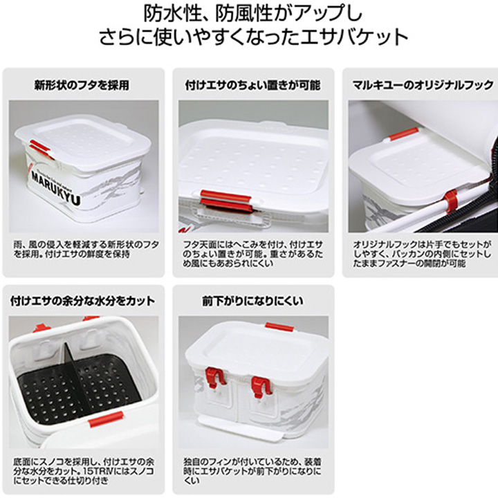 バッカンにセットして使用できる、スタンダードタイプのエサバケットです。新設計の射出成型ブタは雨、風の侵入を軽減し付けエサの鮮度を保持。フタ天面にはへこみを付けているので、付けエサのちょい置きが可能です。フタと本体の接続に金属ワイヤーを使用していないため、サビも防止します。フックは片手でもバッカンに取り付けやすいマルキユーオリジナルフックを採用。バッカン内側にセットしたままファスナーの開閉が可能なので、釣り座の移動時に大変便利です。底面には付けエサの余計な水分をカットするスノコ付き。15TRIVにはスノコにセットできる仕切りが付いています。